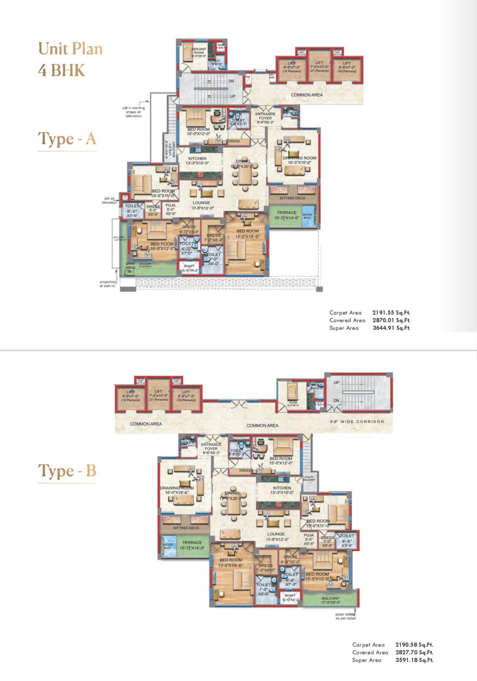Type-B – 4 BHK + Servant + Terrace | 2190.58 | 2827.70 | 3591.18 | ₹ 2,94,53,558 | ₹ 86,188 | ₹ 3,59,118 |